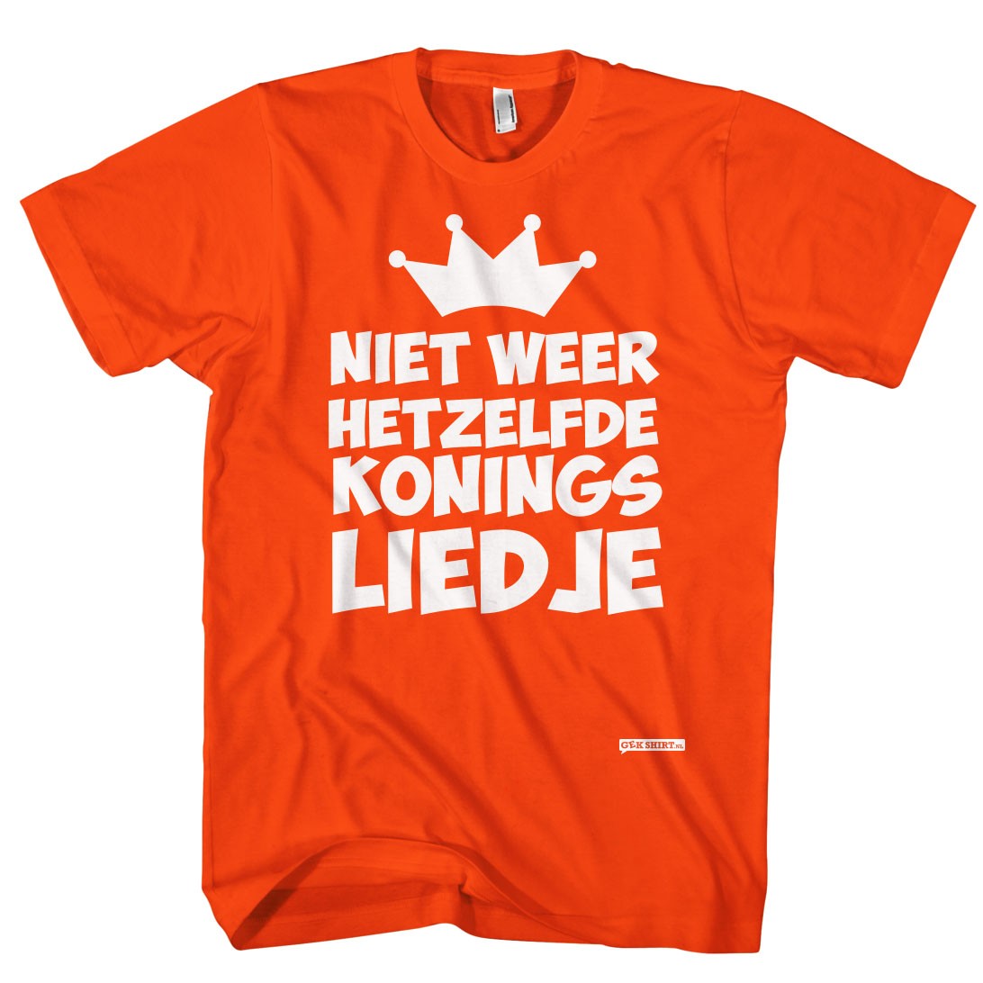 NIET WEER HETZELFDE KONINGSLIEDJE, grappig shirt over het wel of niet komen van een Koningslied. Weer een rede voor Gekshirt.nl om met een gek en grappig t-shirt op de proppen te komen.