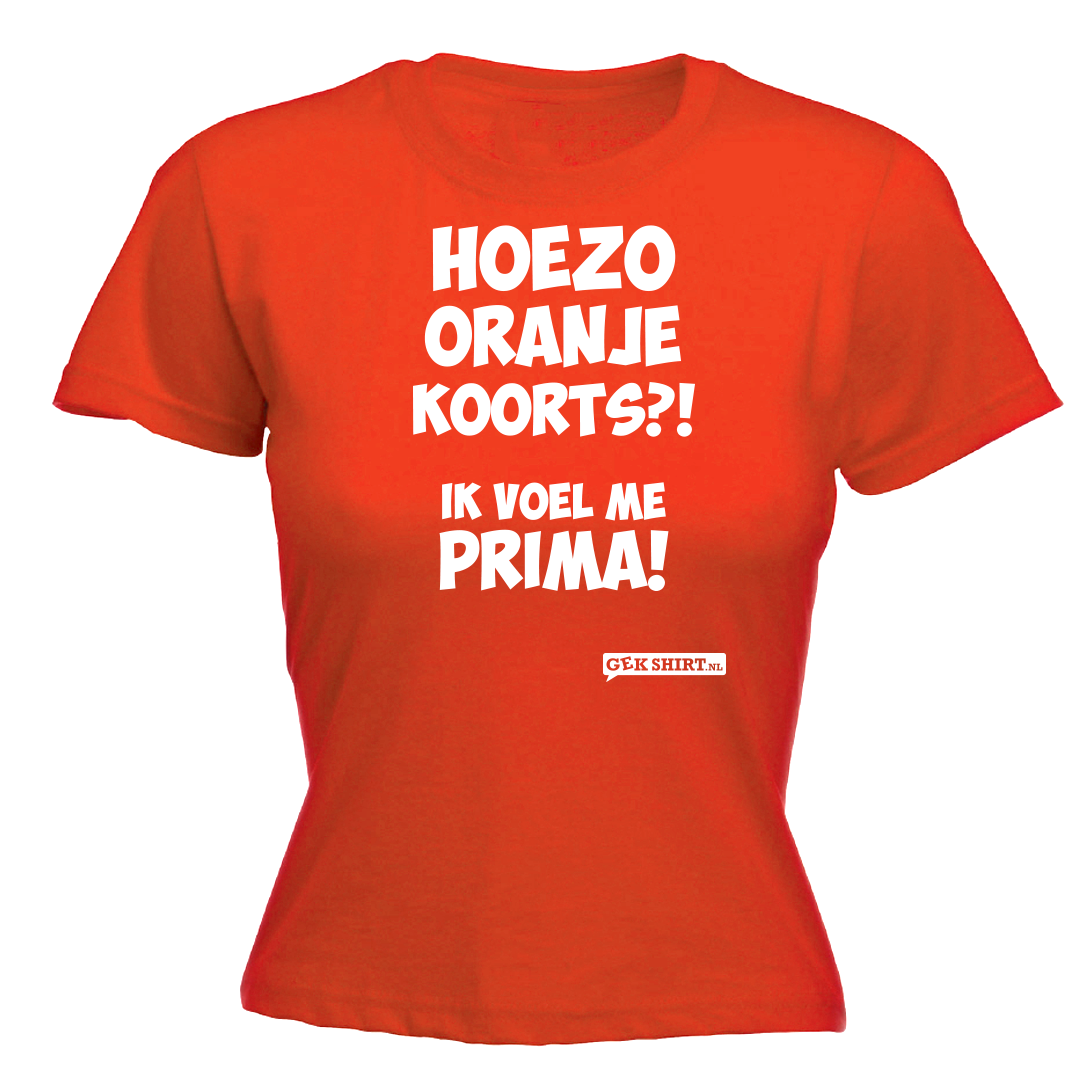 Hoezo oranje koorts?! Ik voel me prima! weer een leuk shirt voor de DAMES dit WK. per direct verkrijgbaar voor maar 14.95 euro Bij Gekshirt.nl. De webshop met de meest originele en leuke wk dames T-shirts van dit moment. Knallend oranje dames shirt met een grappige tekst over de oranje koorts. Wk vrouwen voetbal 2019. Ook hier hebben we shirts voor