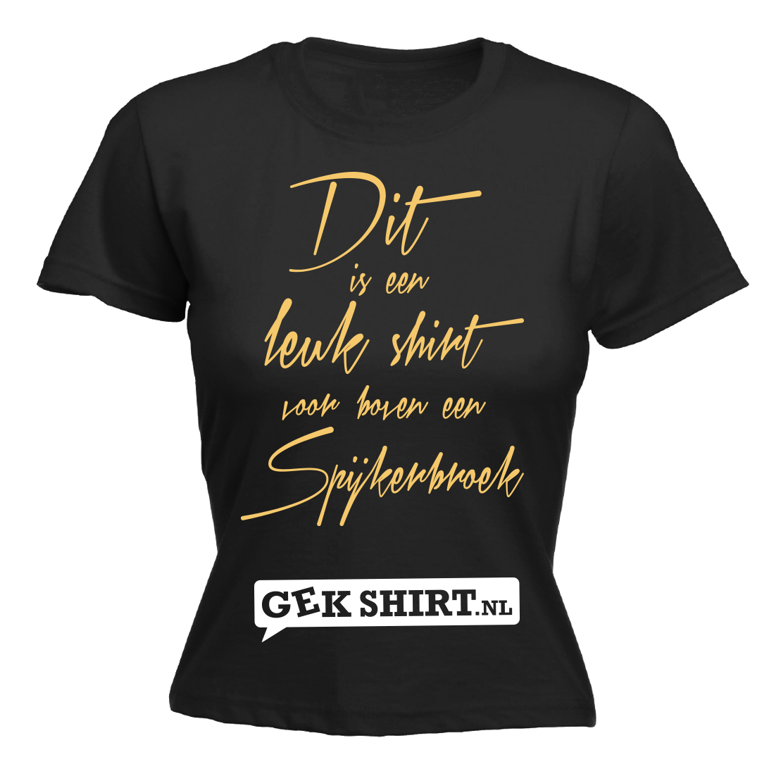 Leuk shirt voor boven een spijkerbroek, licht bruine opdruk op een zwart dames model kwaliteitsshirt.